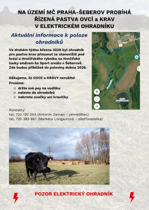 Řízená pastva krav v elektrickém ohradníku na území MČ Praha-Šeberov: ve druhém týdnu března 2026 byl ohradník pro pastvu krav přesunut ze stanoviště pod hrází u Hrnčířského rybníka na Hrnčířské louky směrem ke Sport areálu v Šeberově. Zde budou přibližně do poloviny dubna 2026.