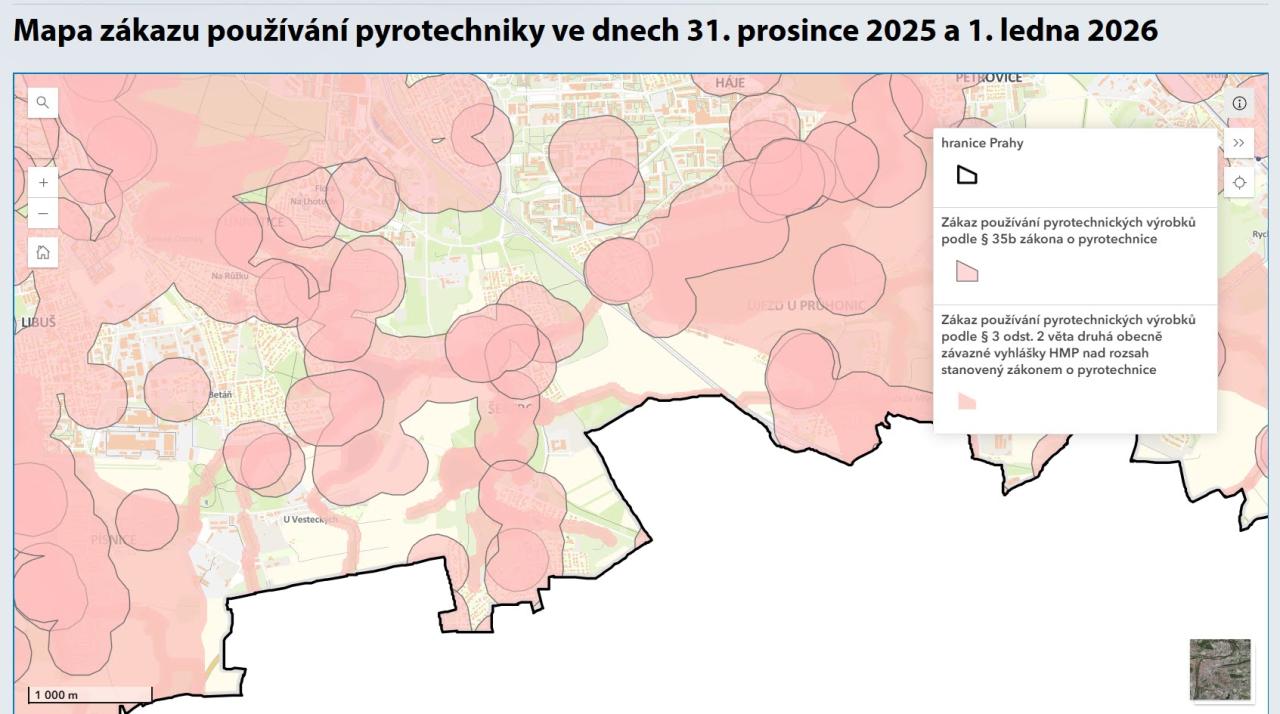 Mapa dále obsahuje zóny, ve kterých je zakázáno zacházet s pyrotechnickými výrobky s výjimkou kategorie F1 podle § 35b zákona č. 344/2025 Sb., kterým se mění zákon č. 206/2015 Sb., o pyrotechnických výrobcích a zacházení s nimi a o změně některých zákonů (zákon o pyrotechnice), ve znění pozdějších předpisů, a další související zákony.