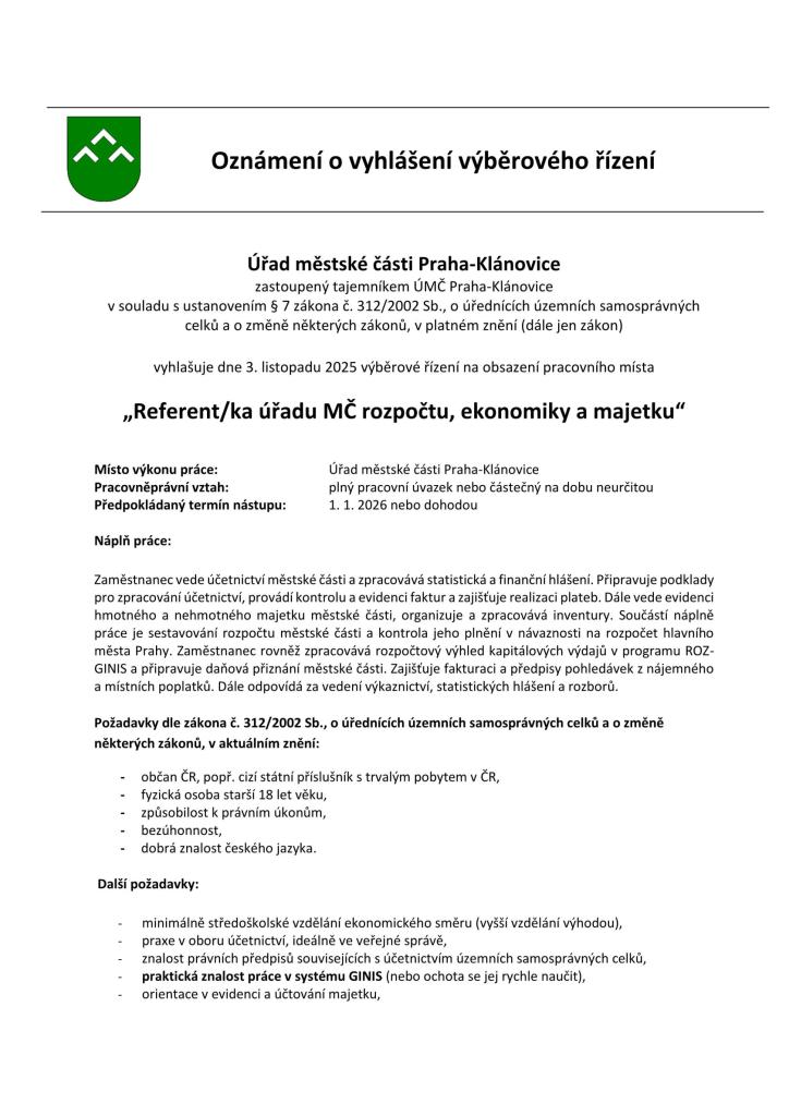 Úřad městské části Praha-Klánovice zastoupený tajemníkem ÚMČ Praha-Klánovice v souladu s ustanovením § 7 zákona č. 312/2002 Sb., o úřednících územních samosprávných celků a o změně některých zákonů, v platném znění (dále jen zákon) vyhlašuje dne 3. listopadu 2025 výběrové řízení na obsazení pracovního místa „Referent/ka úřadu MČ rozpočtu, ekonomiky a majetku“