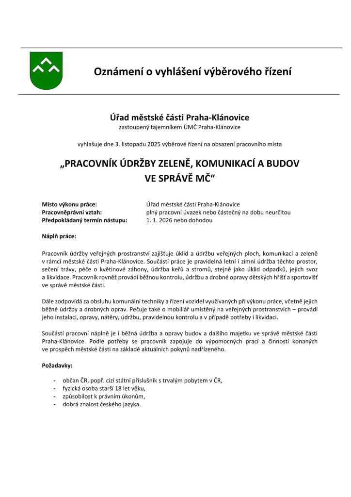 Úřad městské části Praha-Klánovice zastoupený tajemníkem ÚMČ Praha-Klánovice vyhlašuje dne 3. listopadu 2025 výběrové řízení na obsazení pracovního místa „PRACOVNÍK ÚDRŽBY ZELENĚ, KOMUNIKACÍ A BUDOV VE SPRÁVĚ MČ“