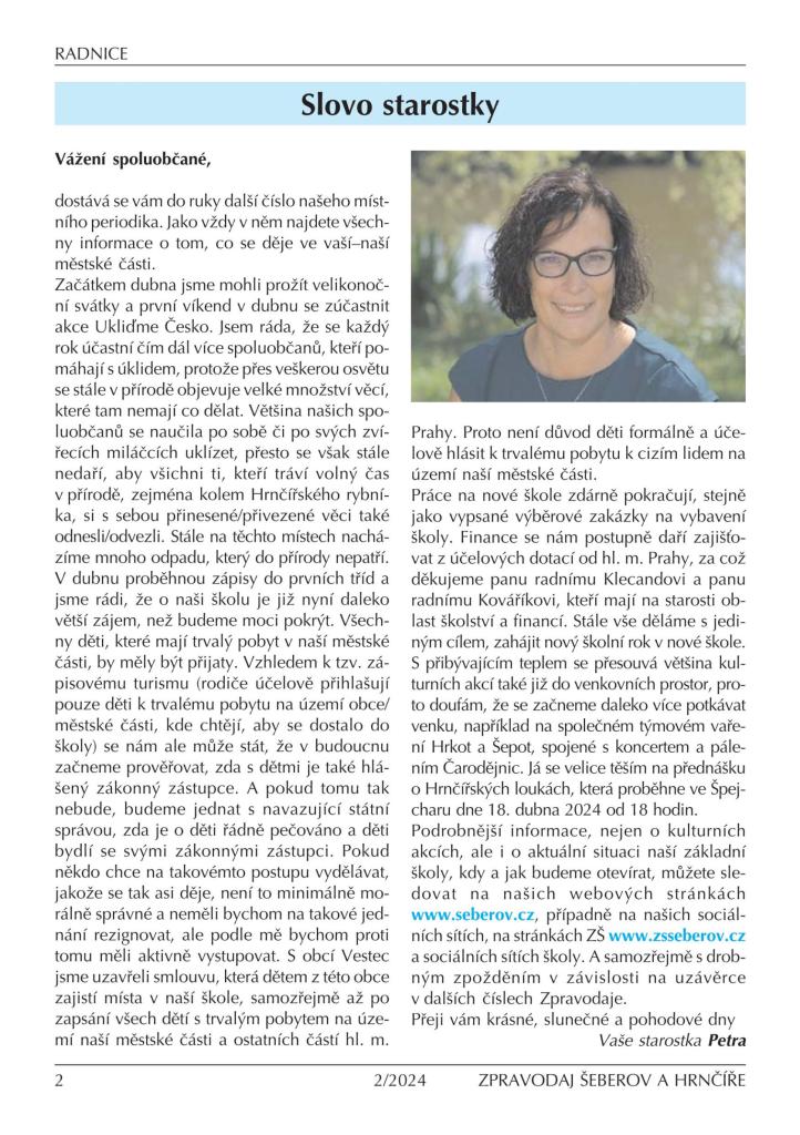 Úvodem vás svým Slovem starostky pozdraví paní starostka Petra Venturová, tentokrát mimo jiné upozornila na tzv. "zápisový turismus", kdy rodiče účelově přihlašují pouze děti k trvalému pobytu na území městské části, kde chtějí, aby se dostalo do školy.