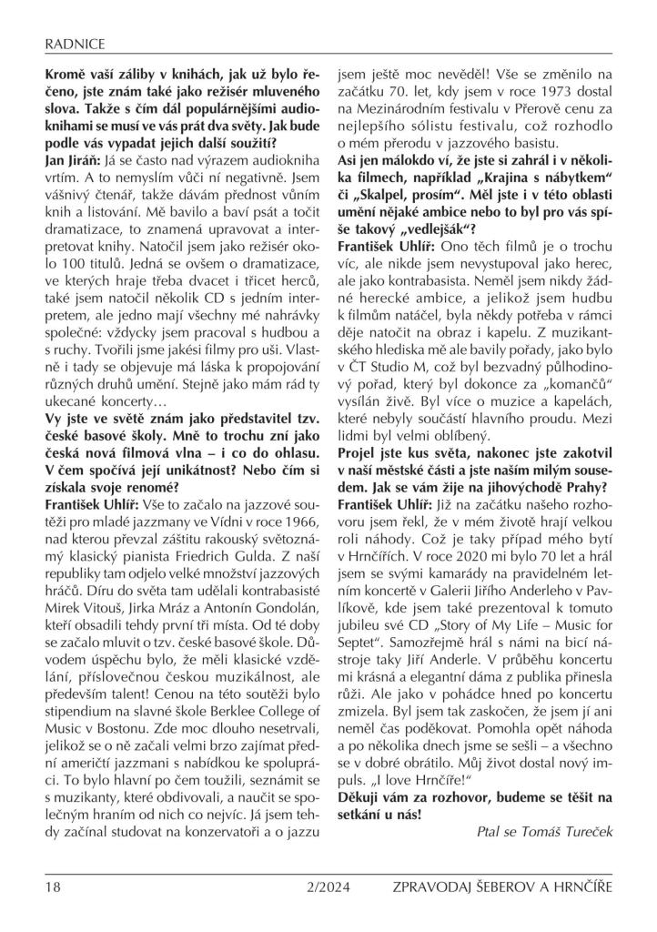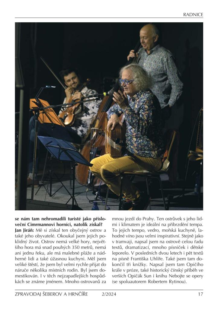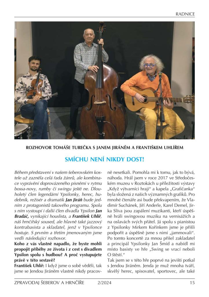 Pozveme vás na další kulturní akce. Ať na venkovní akce na sportareálu, tak na poslední akci šeberovském kostele Církve bratrské na jaře Humor v rytmu bossa novy. Úsměvné vyprávění herce divadla Ypsilon Jana Jiráně doprovázené písněmi v rytmu bossa novy, rumby či swingu spolu s Janem Bradáčem vynikajícím houslistou a Františekem Uhlířem jazzovým kontrabasistou, který je náš hrnčířský soused. Nenechte si ujít rozhovor s panem Jiráněm a panem Uhlířem na str. 15-18.