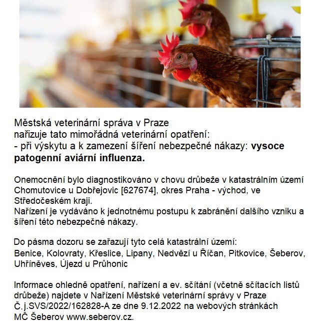 Informace ohledně opatření, nařízení a ev. sčítání (včetně sčítacích listů drůbeže) najdete v Nařízení Městské veterinární správy v Praze Č. j.SVS/2022/162828-A ze dne 9.12.2022.