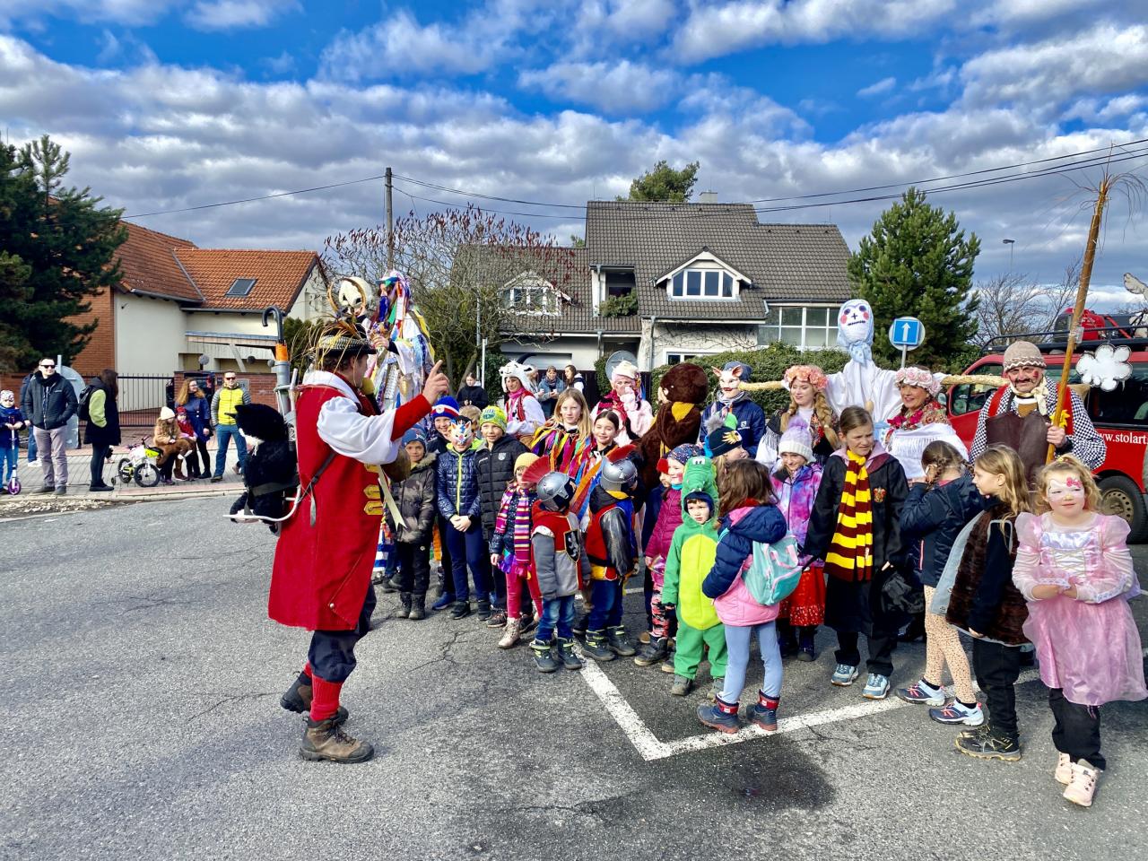 Tradiční masopustní průvod z Hrnčíř do Šeberova s kejklíři, chůdaři a panem principálem Divadla V Pytli.