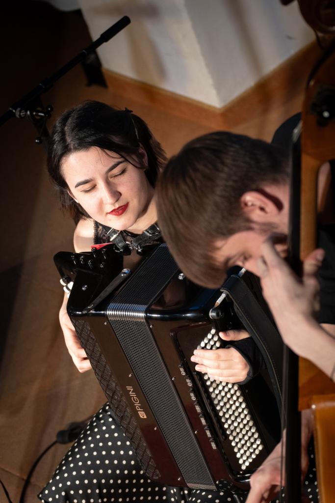 Kytarista Filip Novák zužitkoval svou skvělou techniku a zkušenosti z mistrovských kurzů. Jeho hra skvěle souzněla s ostatními v kapele. Vystoupení kontrabasisty Jakuba Janíčka je prostě komplexní: kromě hry na kontrabas se smyčcem či bez smyčce, bubnování na všechny dřevěné části kontrabasu (včetně hlazení dlaní) máte pocit, že zvládne ještě tančit kolem svého nástroje… Tajemná houslistka Anabel De Luca, původem z Ukrajiny, vyčerpala snad všechny možnosti a způsoby hry na housle, kterým se věnuje už od šesti let. Něžná klarinetistka Anežka Šolcová nás překvapila rychlostí pohybu prstů a způsobem hraní. Vypadalo to, že místo na klarinet hraje na splašeného koně, kterého dokáže usměrnit přesně tak, jak ona chce. Akordeonistka Anastasija Myronchuk byla neuvěřitelná využitím nástroje nejen ke hře na pianové klapky nebo basové knoflíky, ale i k „dýchání” měchu akordeonu. Emotivně nám zazpívala brazilskou píseň o uvadajících kaméliích.