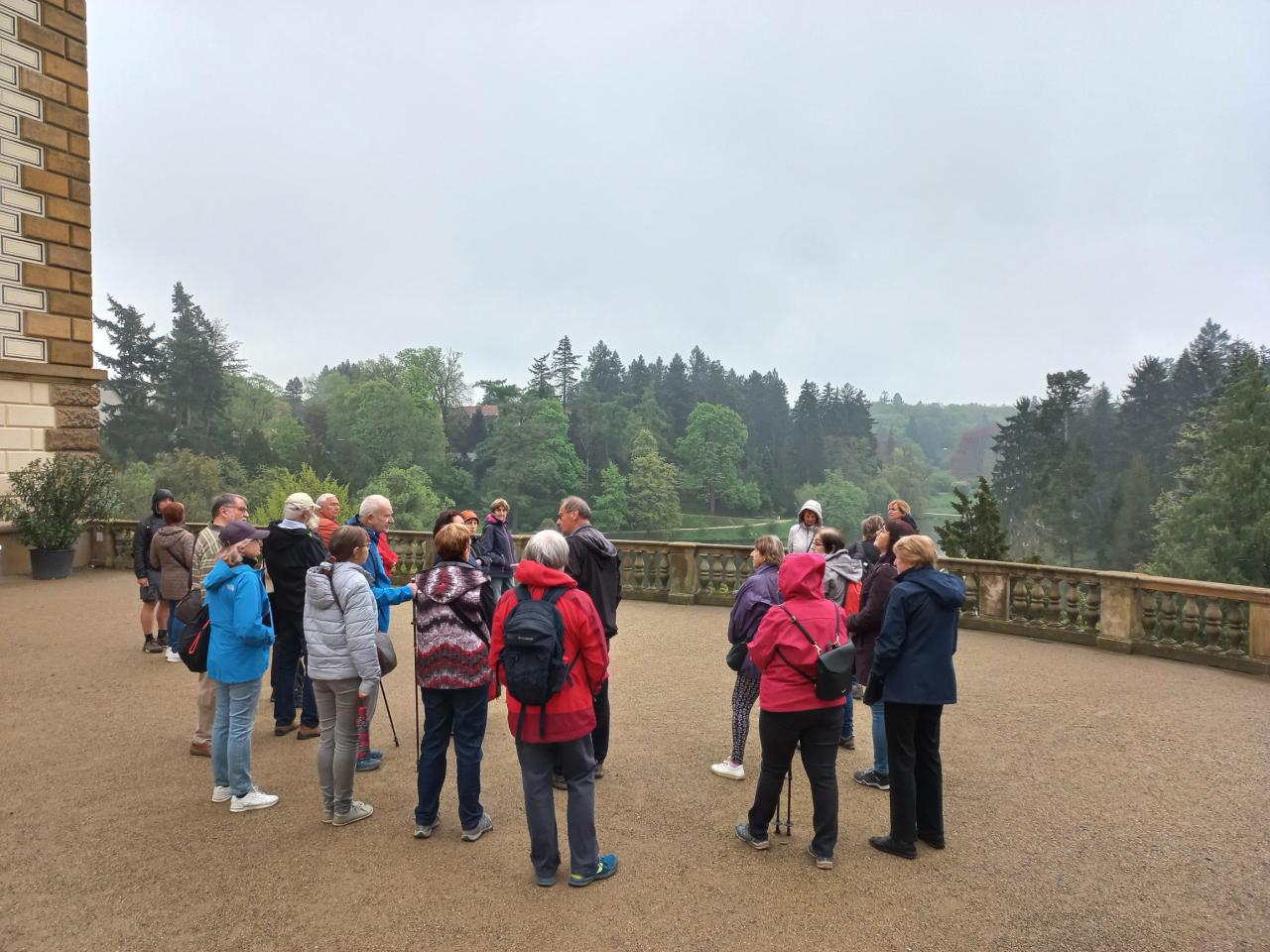 Každý průhled do parku má totiž splňovat určité krajinářské zákonitosti. Nejlépe to pan Burda vysvětlil na pohledu od vzdálenějšího břehu Podzámeckého rybníka zpátky na Průhonický zámek. Tento určitě najdete ve všech průvodcích nebo internetových prezentacích Průhonického parku, protože je prostě dechberoucí. Teprve z výkladu dendrologa se členové klubu spolu s Jitkou Žákovou, která pro ně vycházku zajistila, dozvěděli, se jedná o promyšlenou kompozici. Sestupová cesta se schodištěm od zámku k rybníku je totiž vytvořena tak, aby na pohledu k zámku nebylo poznat, že tam vůbec je.