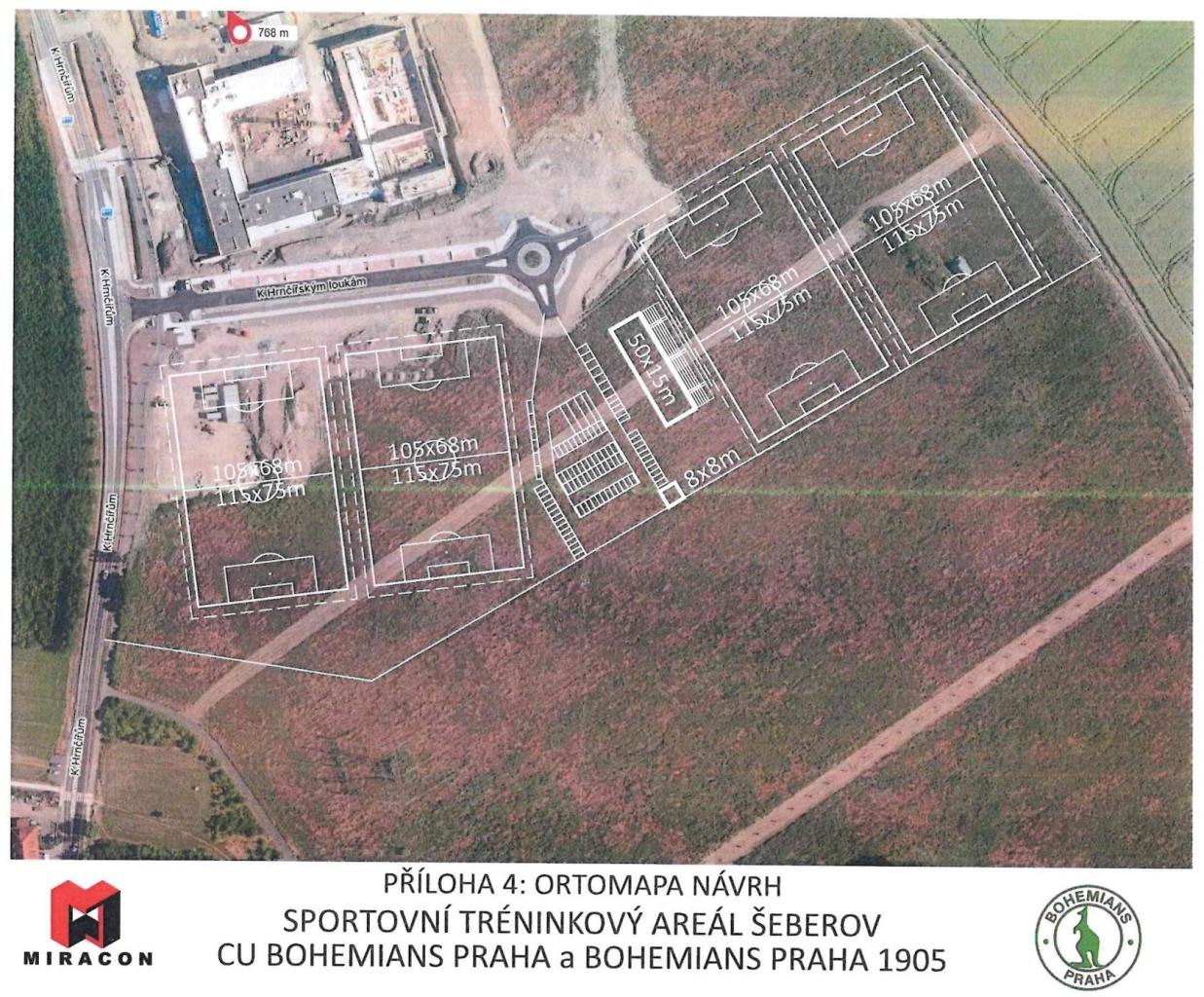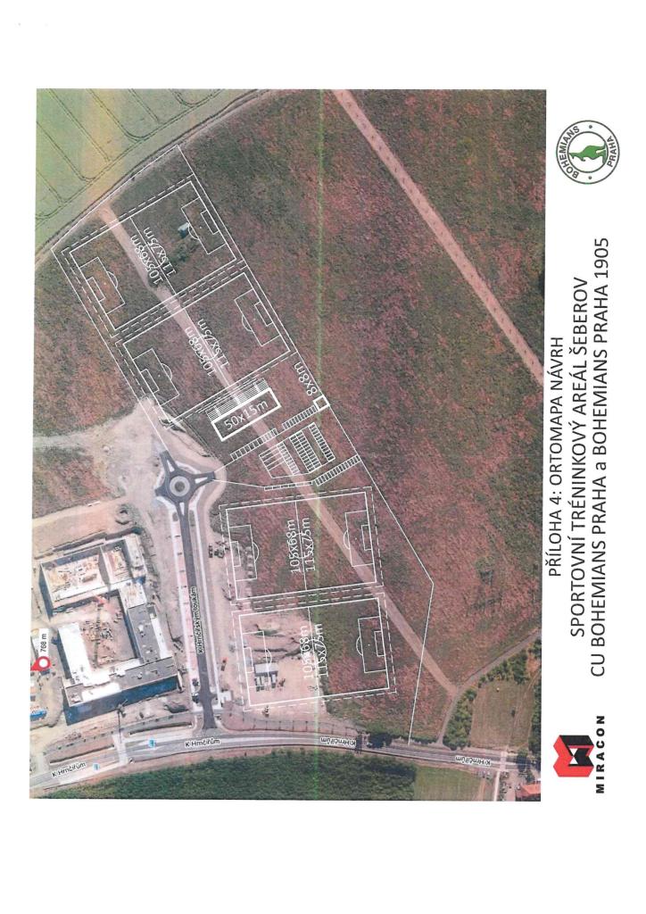 Prezentovaný sportovní tréninkový areál CU Bohemians Praha, z.s. a Bohemians Praha 1905, a.s. na poradě zastupitelů vypracovaný spol. Miracon v říjnu 2024, využívající pouze lépe zastavitelnou část NAŠEHO POZEMKU.