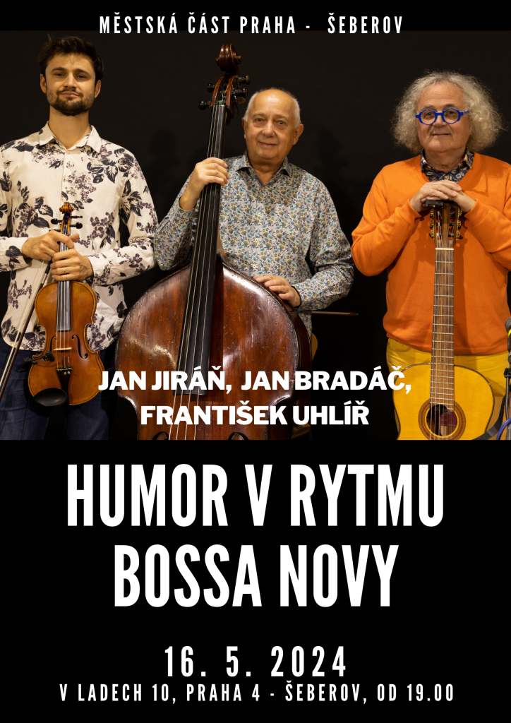 Městská část Praha – Šeberov si vás dovoluje pozvat na představení Jan Jiráň + František Uhlíř + Jan Bradáč: Humor v rytmu bossa novy ve čtvrtek 16. 5. 2024 od 19 hodin v šeberovském Kostele Církve bratrské V Ladech 10 v Praze - Šeberově.