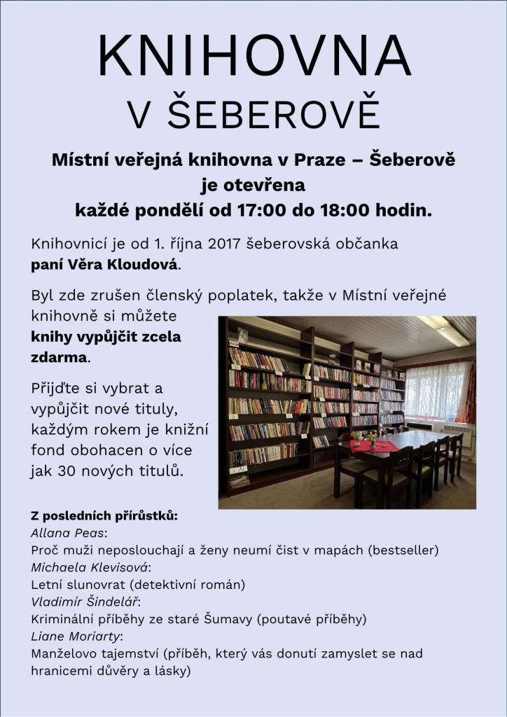 Místní veřejná knihovna v Praze – Šeberově na adrese K Hrnčířům 34, Praha - Šeberov je otevřena každé pondělí od 17:00 do 18:00 hodin.