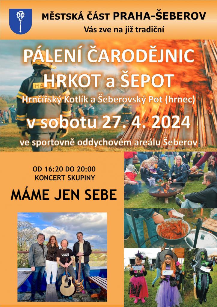 Pálení čarodějnic bude v sobotu 27. dubna 2024 ve sportovně oddychovém areálu v Šeberově. Celý den bude nabitý. Nebudou chybět atrakce a soutěže pro děti včetně soutěže o nejlepší čarodějnou masku. Pokusíme se navázat na předchozí ročníky soutěže ve vaření na ohni HRKOT a ŠEPOT. Budeme opékat špekáčky. Zahraje kapela MÁME JEN SEBE. Zapálíme čarodějnickou vatru.