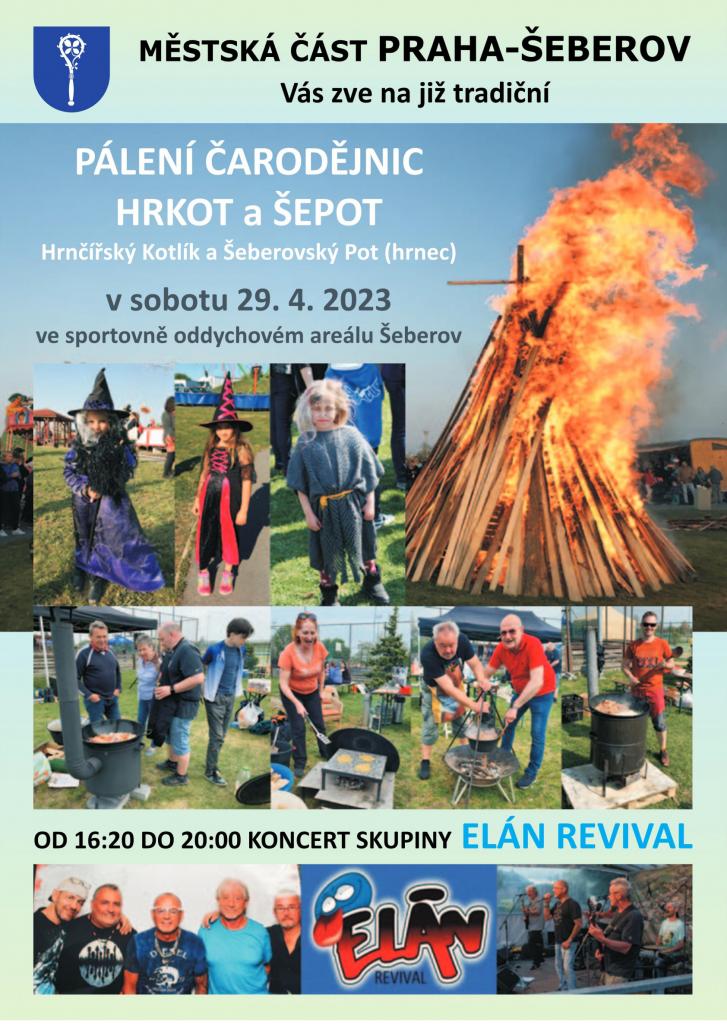 Pálení čarodějnic bude v sobotu 29. dubna 2023 ve sportovně oddychovém areálu v Šeberově. Celý den bude nabitý. Nebudou chybět atrakce a soutěže pro děti včetně soutěže o nejlepší čarodějnou masku. Pokusíme se navázat na úspěšný první ročník přehlídky ve vaření na ohni HRKOT a ŠEPOT. Budeme opékat špekáčky. Zahraje v Šeberově a Hrnčířích oblíbená kapela ELÁN REVIVAL. Zapálíme čarodějnickou vatru.