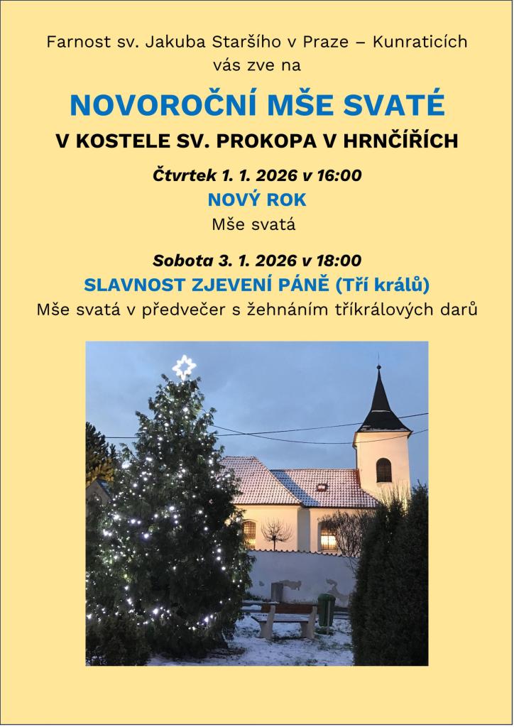 Farnost Kunratice vás zve na novoroční mše svaté v kostele sv. Prokopa v Hrnčířích a v kostele sv. Jakuba Staršího v Kunraticích.
