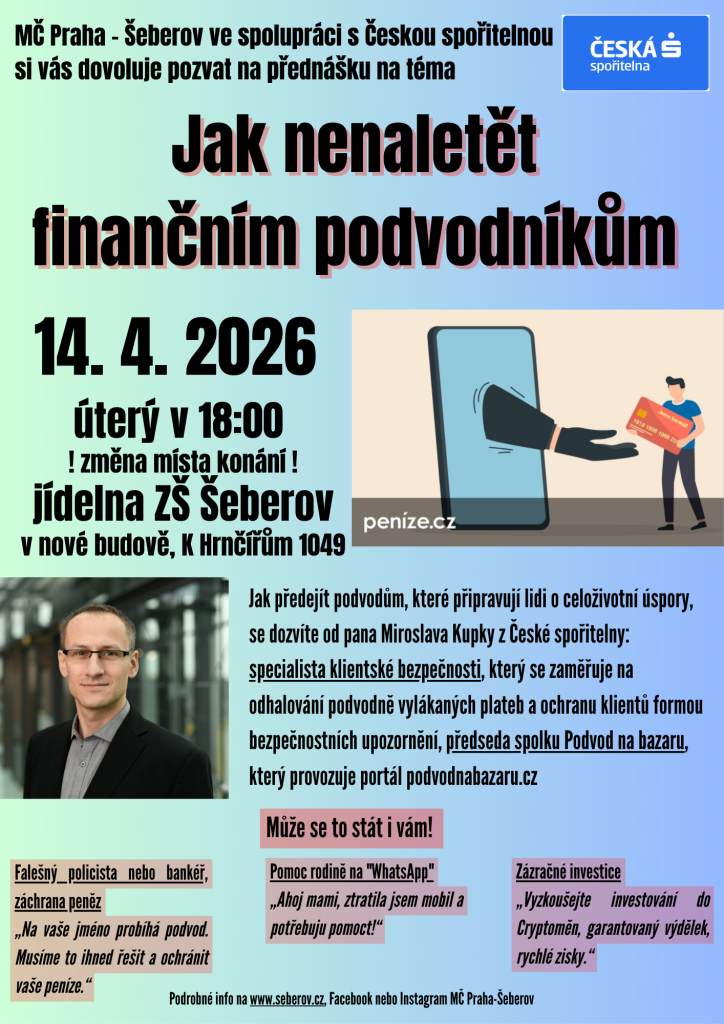 Dovolujeme si Vás tímto pozvat v úterý 14. dubna 2026 od 18 hodin do jídelny nové budovy základní školy na přednášku na téma Jak nenaletět finančním podvodníkům. Jak předejít podvodům, které připravují lidi o celoživotní úspory, se dozvíte od pana Miroslava Kupky z České spořitelny.