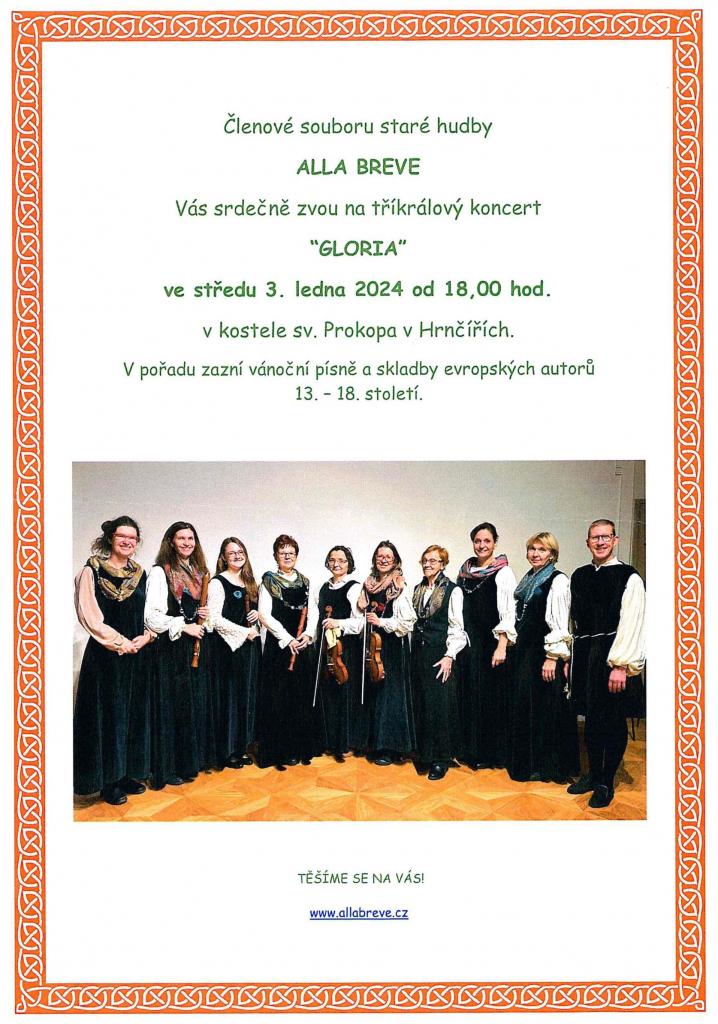 Členové souboru staré hudby ALLA BREVE Vás srdečně zvou na tříkrálový koncert "GLORIA" ve středu 3. ledna 2024 od 18 hodin v kostele sv. Prokopa v Hrnčířích.